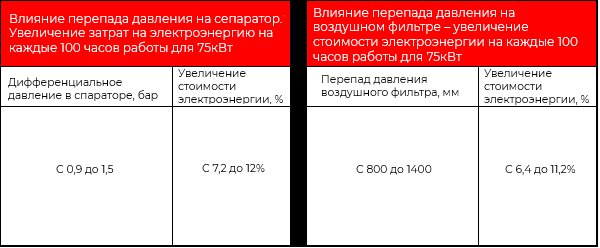 В таблице ниже приведен пример влияние задержки замены расходных материалов для компрессора мощностью 75 кВт.